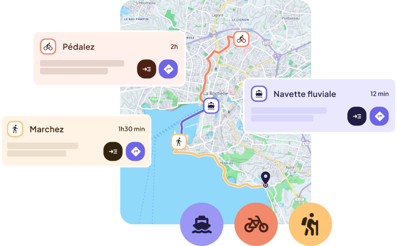 A l’aide du réseau national (train/bus), Loopi accompagne vos visiteurs de bout en bout, en considérant aussi le dernier kilomètre. Depuis la gare, l’arrêt de bus ou le parking relais, la solution combine marche, vélo et transports locaux pour rejoindre facilement hébergements, sites touristiques et points d’intérêt, sans dépendre de la voiture.
